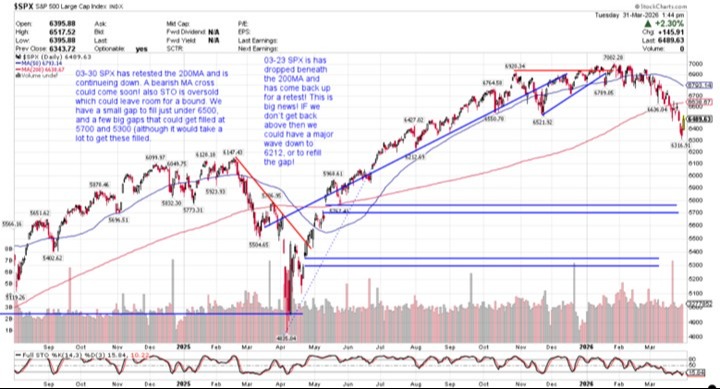 Today (03-31-2026) the markets, specifically the S&P, have had a major bounce. Is this a dead cat bounce, or a true turnaround? From a technical standpoint we could be going up for a retest of the 200MA or simply a gap fill. The biggest technical indicator to be aware of is the bearish cross of the 50MA and the 200MA (the “death cross”). Every major bear market is preceded by this bearish cross, but not every bearish cross precedes a bear market. If things get real bad the S&P could go down to 5,700 or 5,300 for a gap fill. In short, this looks relatively bearish, but there are no guarantees. Furthermore, technical analysis seems to be no match for Trump’s tweets.